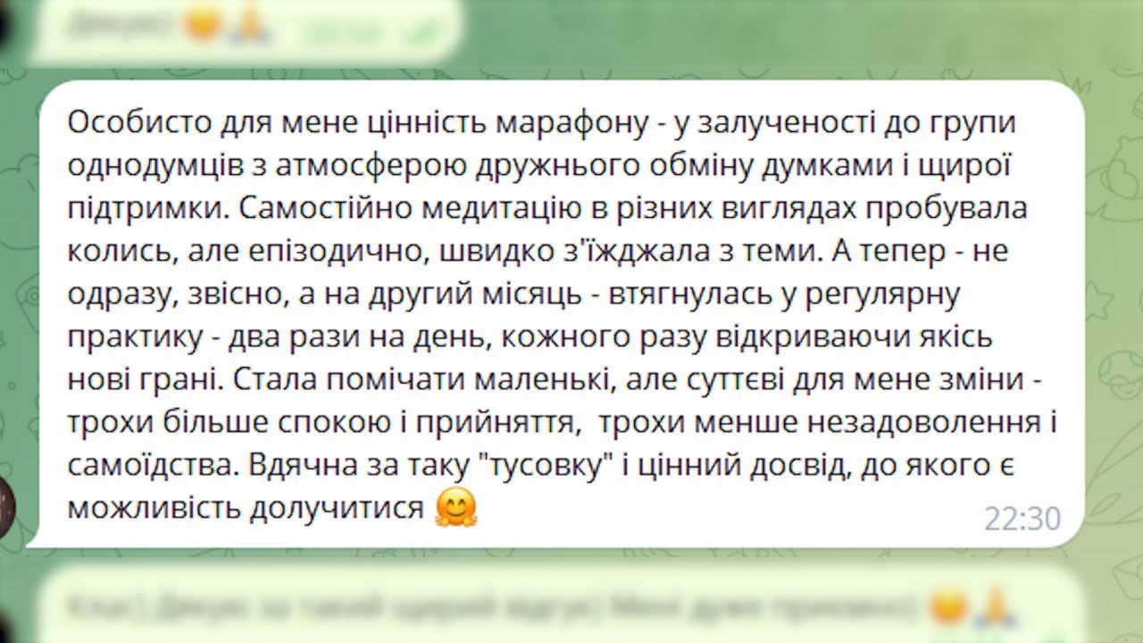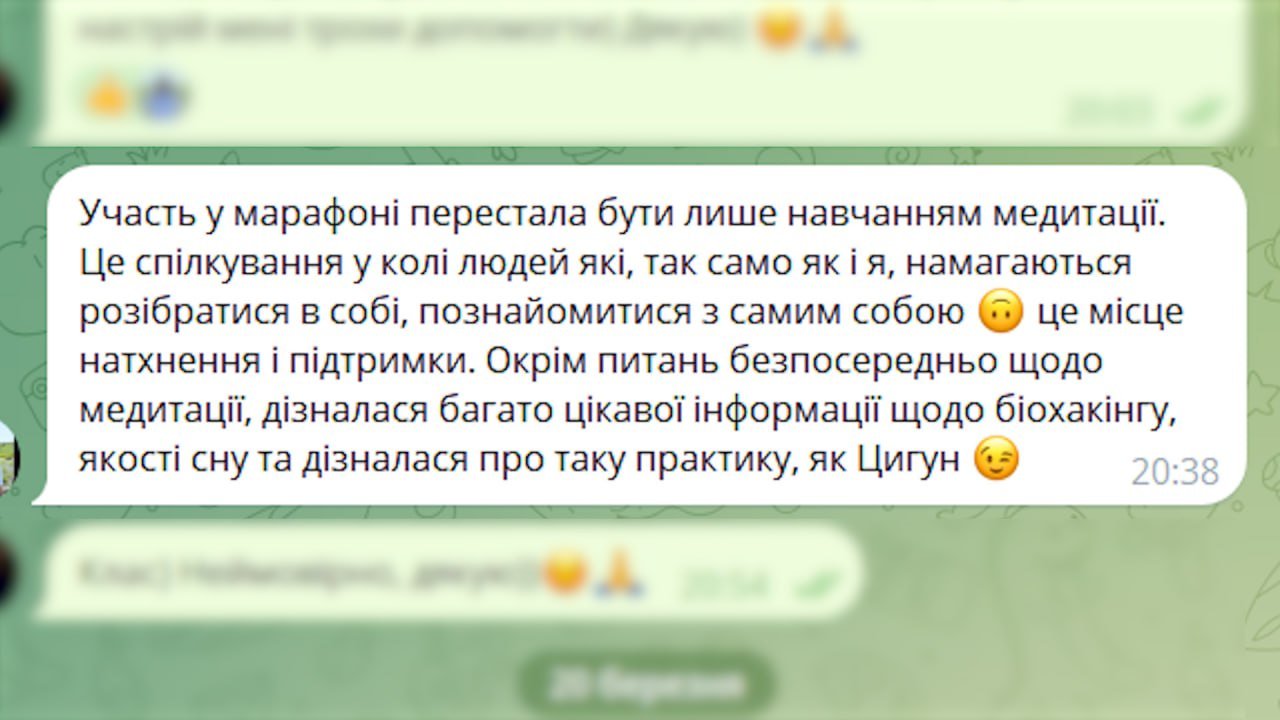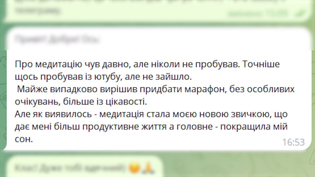 Раніше я могла крутитися в ліжку по дві години перед сном. Після марафону навчилась швидко розслаблятись і засинати без таблеток. Це реально змінило мої вечори, дякую!